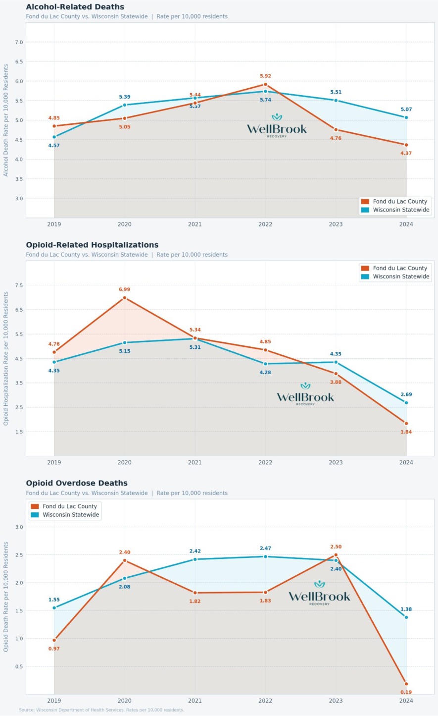 Compared to the Wisconsin statewide average rate for alcohol deaths, which sits at 5.07 per 10,000 residents in 2024, and still above its 2019 starting point of 4.57, Fond du Lac is improving faster than the state as a whole.